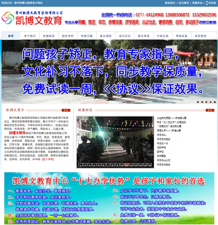凱博文教育——專(zhuān)業(yè)從事10~17周歲有網(wǎng)癮、早戀、叛逆、自卑自閉、奢侈消費(fèi)、厭學(xué)逃課、離家出走、有暴力傾向、心理人格偏差、打架斗毆、親情冷漠、自理能力差的孩子的轉(zhuǎn)化教育.學(xué)校師資力量雄厚,擁有一批專(zhuān)業(yè)的心理輔導(dǎo)教師、優(yōu)秀文化課和專(zhuān)業(yè)技能課教師及德才兼?zhèn)?、軍事素質(zhì)過(guò)硬的軍訓(xùn)教官隊(duì)伍。學(xué)校設(shè)施先進(jìn)、設(shè)備完善,擁有標(biāo)準(zhǔn)的籃球場(chǎng)、足球場(chǎng)、羽毛球場(chǎng)、乒乓球場(chǎng)、形體訓(xùn)練室、心理診療室、心理輔導(dǎo)室,是孩子陶冶情操、提升自我、重塑認(rèn)知、學(xué)文練技的理想搖籃。我們已成功轉(zhuǎn)化了千余名“問(wèn)題孩子”,深受同行業(yè)、社會(huì)各界、學(xué)生及家長(zhǎng)的一致好評(píng)。